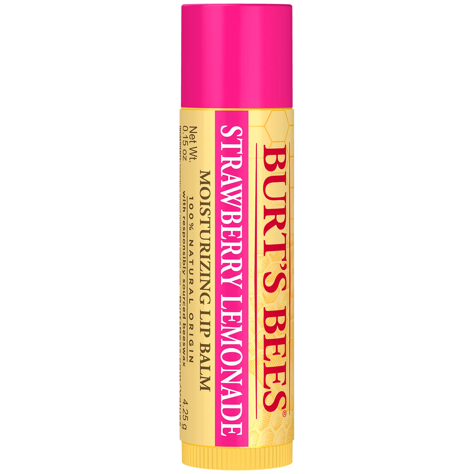 Burt's Bees Strawberry Lemonade Moisturising Lip Balm provides all day intense moisture and instantly softens and hydrates your lips to help prevent dryness, cracking or chapping. Infused with responsibly sourced beeswax to richly moisturise and soothe lips, the nourishing oils and butters will replenish lips.